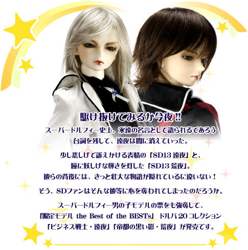 We present to you our Dolpa 20 Collection 'Limited Models: the Best of the BESTs', who completely hijacked the votes for SD Boy Models: 'Business Warrior - Tohya' and 'Black Shadow of the Capital - Kohya'.